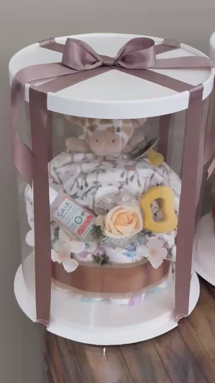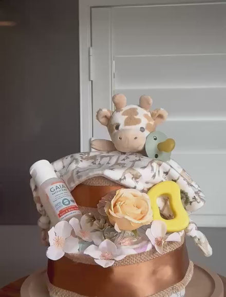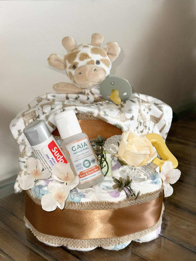 Bring a little extra joy to baby’s world with our giraffe-themed nappy cake, lovingly stacked with practical essentials and sweet surprises. Thoughtful, stylish, and ready to impress, it’s the perfect baby shower or new arrival gift.