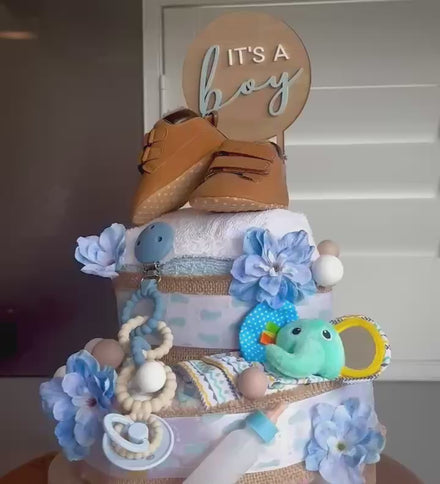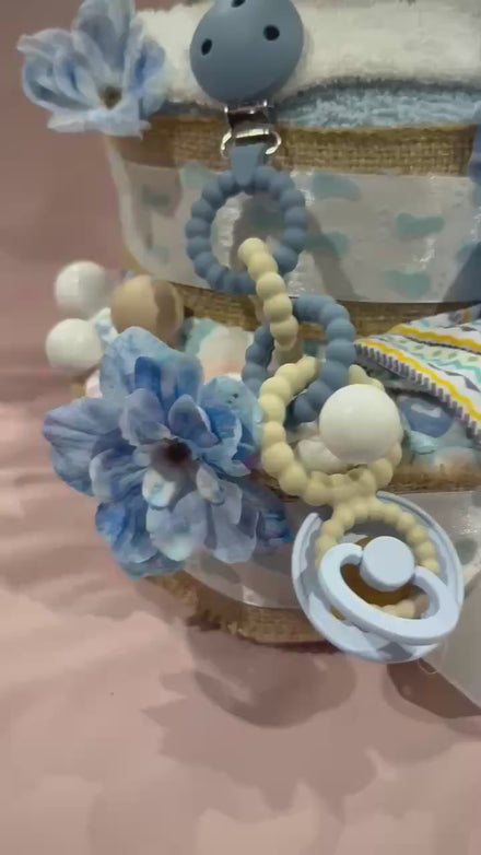 Thoughtfully crafted, our large nappy cake is both a beautiful centerpiece and a useful gift for new parents. Perfect for baby showers, gender reveals, or a precious welcome-home surprise.